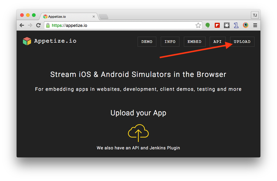 Now that you’ve generated the executables, visit Appetize.io and click the “UPLOAD” button in the top-right corner of the screen:
