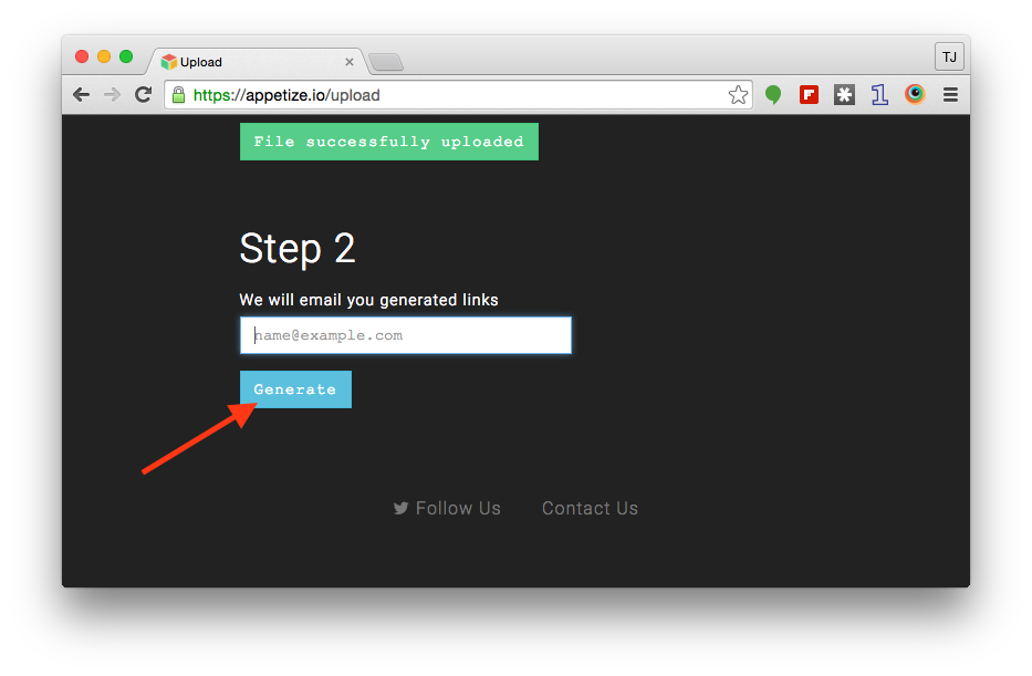 After the file upload completes, scroll to the bottom of Appetize’s upload page, enter your email address, and hit the blue “Generate” button.