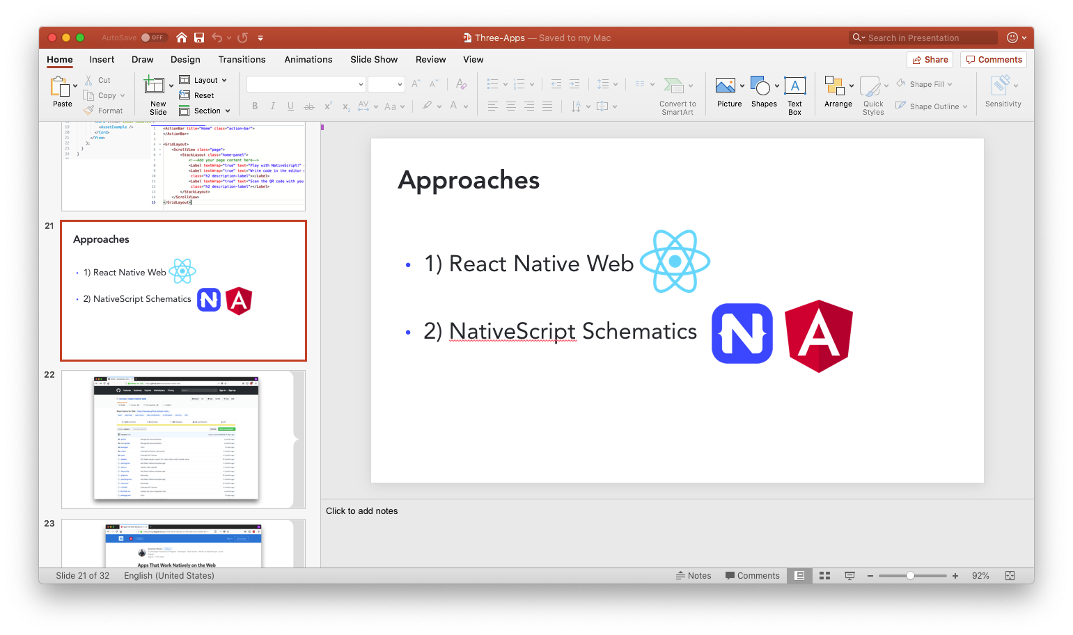 Before I introduced each framework I asked the audience, “How many people here are familiar with React Native”, and then, “How many people here are familiar with NativeScript”.
