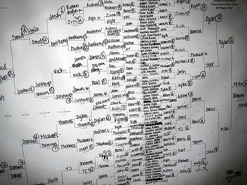 The biggest thing I remember about the tournament itself is that it took forever, as it was a double-elimination format with something like 50+ players, and only two machines to do the matches on. I took a picture of the final bracket at the end, and if you look closely you can see “TJ” being eliminated in the bottom-left corner.